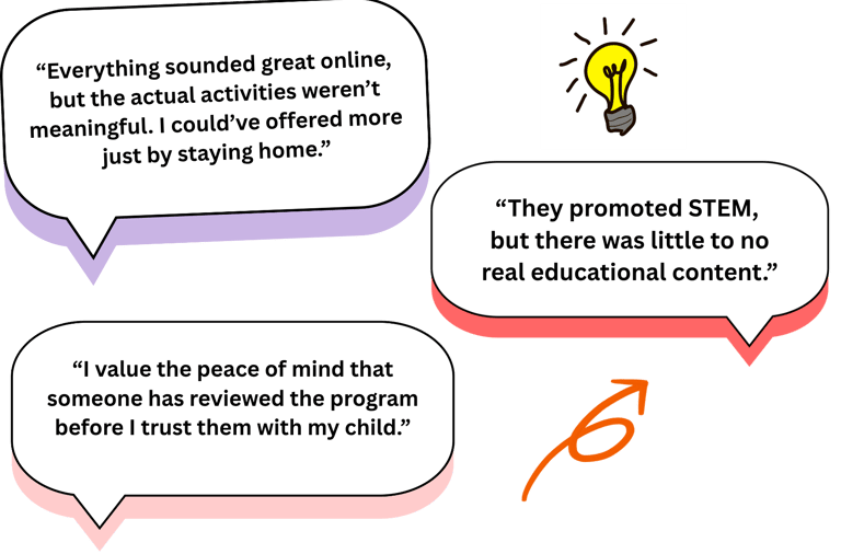 Many parents shared that websites and flyers looked appealing, but the actual program experience didn’t match. Some felt misled, while others simply wished there was an easier way to compare safety and quality standards.